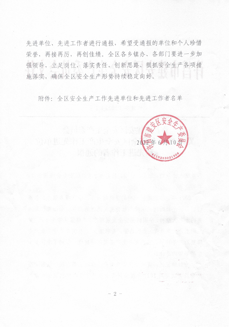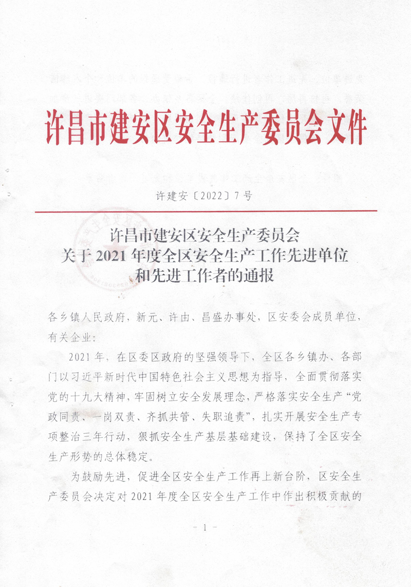 2021年,我公司以習(xí)近平新時(shí)代中國(guó)特色社會(huì)主義思想為指導(dǎo),全面貫徹落實(shí)黨的十九大精神,牢固樹立安全發(fā)展理念,嚴(yán)格落實(shí)安全生產(chǎn)“黨政同責(zé)、一崗雙責(zé)、齊抓共管、失職追責(zé)”,狠抓安全生產(chǎn)基層基礎(chǔ)建設(shè),排除潛在的安全隱患,保持了廠區(qū)安全生產(chǎn)形勢(shì)的總體穩(wěn)定。故許昌市建安區(qū)安全生產(chǎn)委員會(huì)對(duì)我公司在2021年度安全生產(chǎn)工作中的積極貢獻(xiàn)進(jìn)行了表彰,授予于“全區(qū)安全生產(chǎn)工作先進(jìn)單位”稱號(hào)。